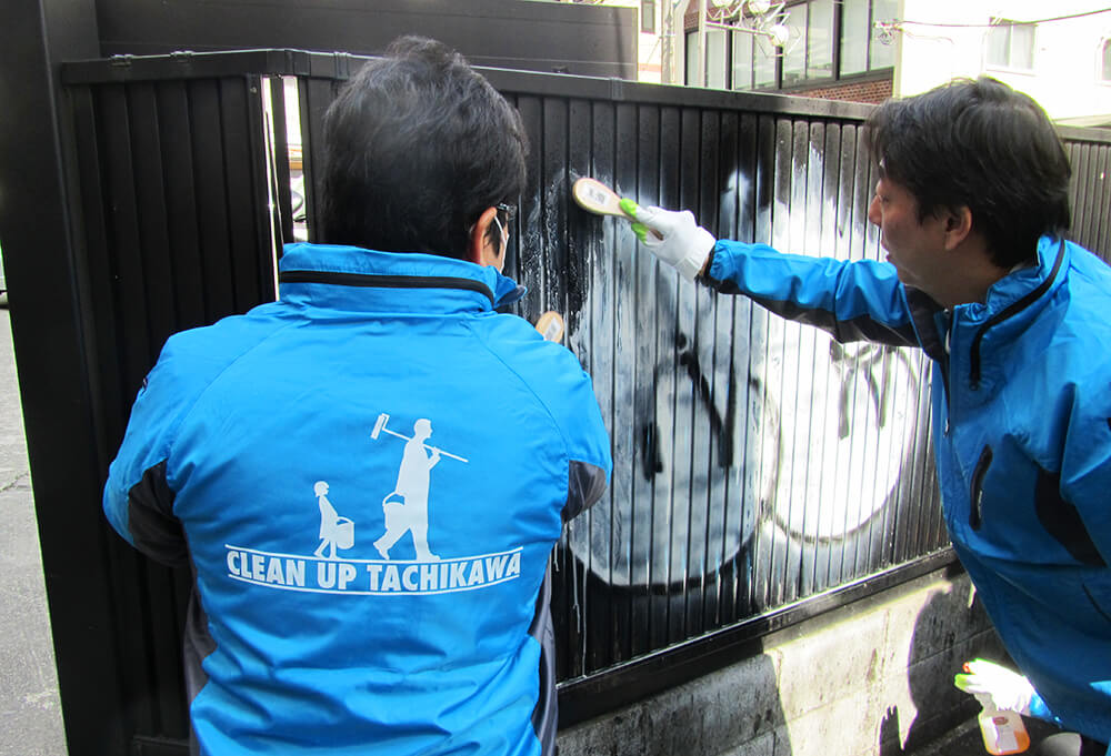 立川通り曙町から錦町に至るアンダーパスを中心に、市内の子供たち、地域の方々、立川警察署署員の方々に協力してもらいながら、落書き消去活動と清掃活動を実施したのじゃ。
